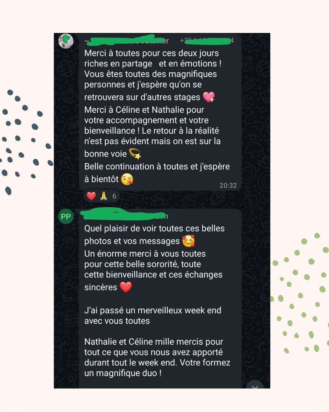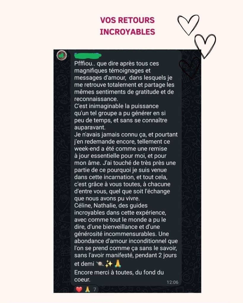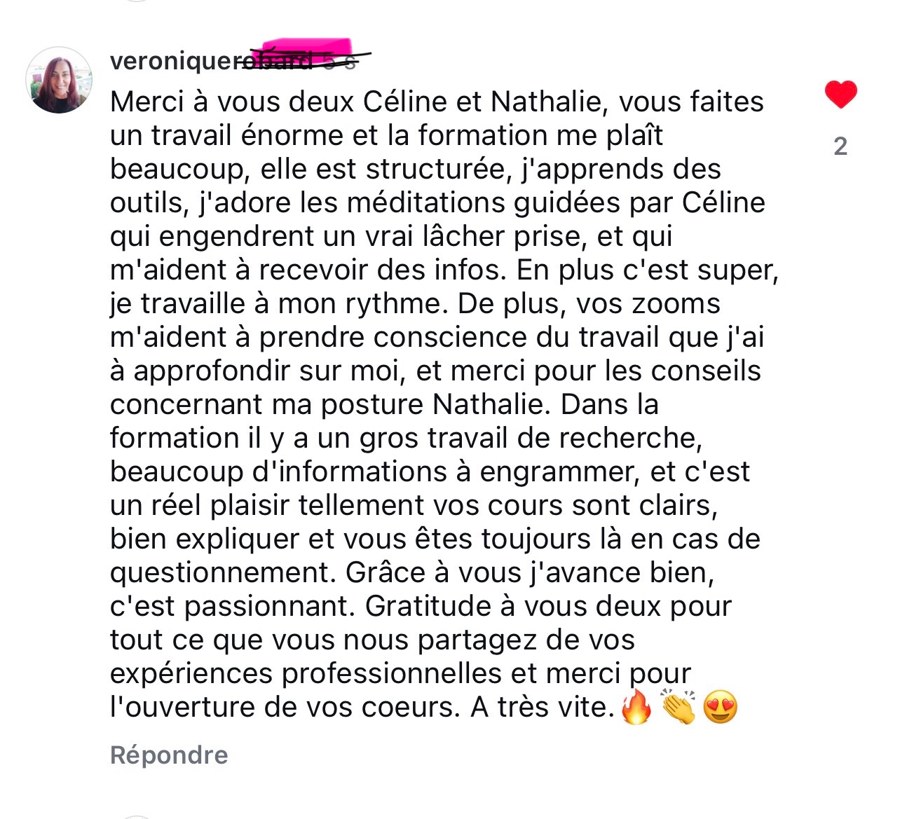 une légitimité par les exercices qu'elle propose. J'ai adoré pouvoir échanger avec les autres filles ayant choisi leur formation et pouvoir partager des moments si profonds et magiques ! Sincèrement,