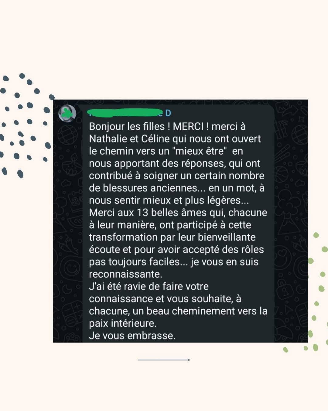 je voyais déjà des changements dans ma vie, car creuser la psychogénéalogie c'est tellement plus puissant que tout ce que j'aurais pu imaginé. Les chapitres sont hyper intéressants, complets, ça nous pousse à travailler sur plein d'aspects de notre vie.